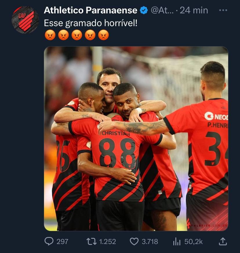 O Athletico postou em duas redes sociais uma foto de jogadores comemorando a vitória e comentou: “Esse gramado horrível”, que é justamente a frase que Gabigol tinha dito na entrevista a ESPN.